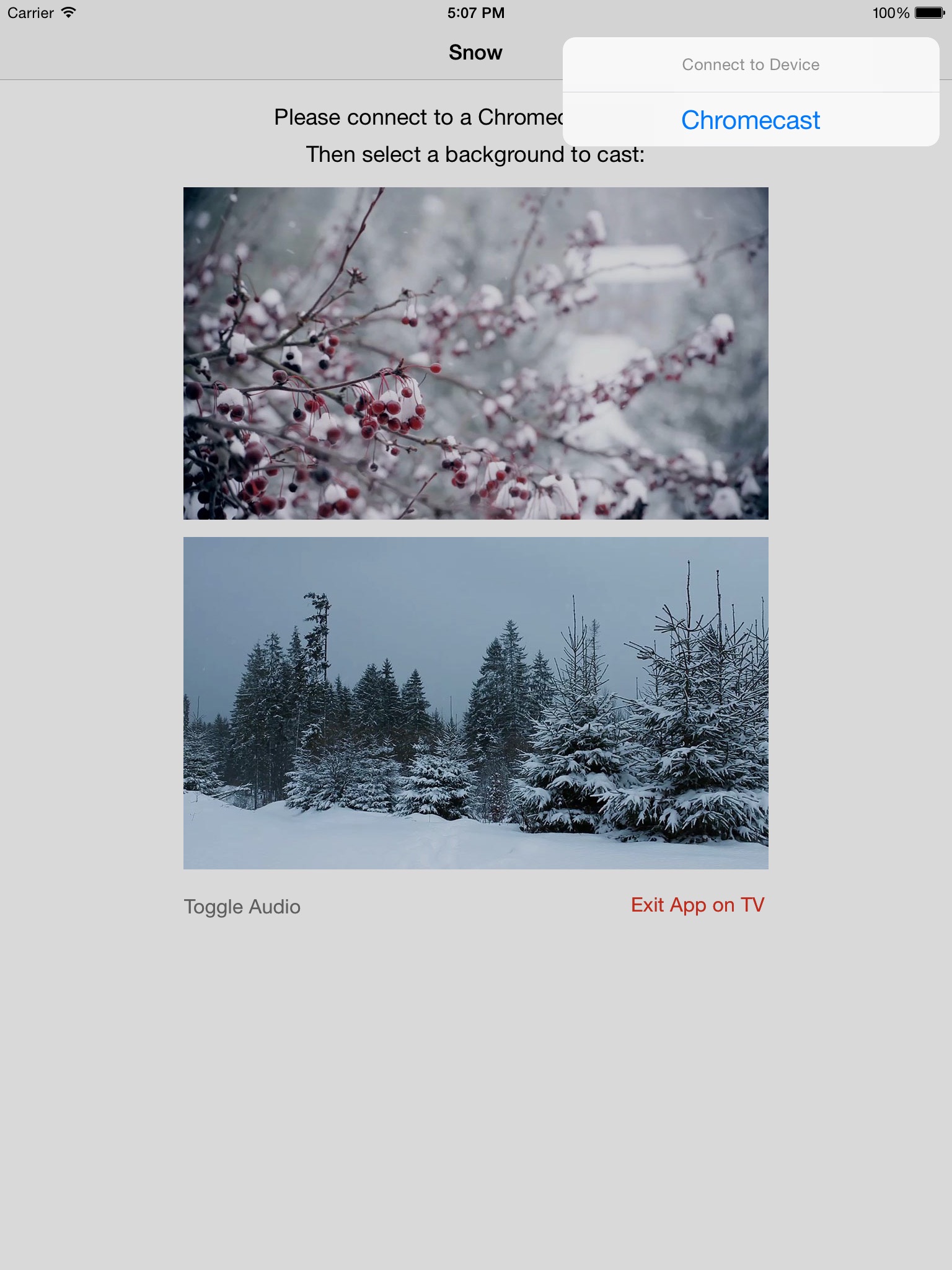 You can see relaxing snowfall scenes (with audio) as the live background for your TV (that has a connected Chromecast device). You can select the background with your iPhone or iPad.