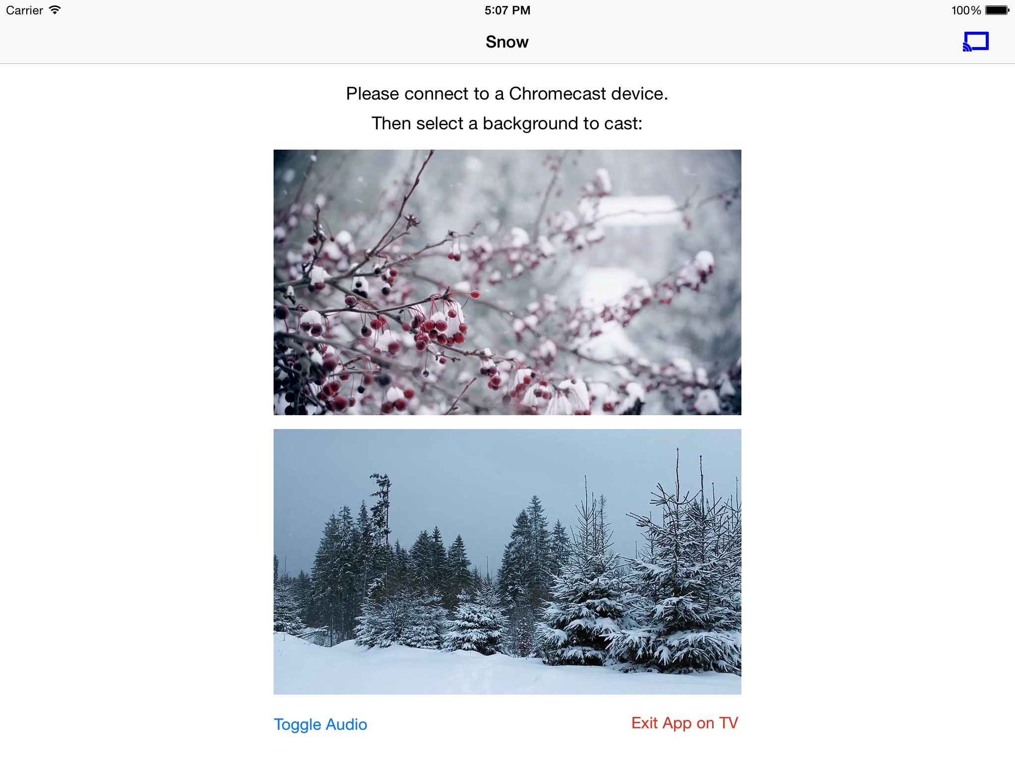 • Cast high quality live backgrounds (with audio) to your TV - you can pick from 2 scenes - winter snow falling on a cherry tree or a serene snowfall scene in forest woods.