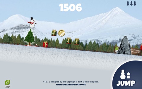 You help the Skiing Snowman. Ride the Candy Cane, collecting presents and bonus items along the way. Tap the screen to jump him over rocks and trees - hit one of those and youll lose one of the three lives. Look out for the bonus coins, which can give your snowman a mystery advantage or extra points. Avalanches can come to distract you and your snowman, but will not harm him. Includes an online leaderboard.