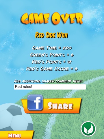 Soccer Dual also has a 2 player mode so you can play against a friend on the other side of your iPad. Move your flippers anywhere in your side of the play field to attack your friends goal and defend your own goal. Find your friends game play weakness to win the game.