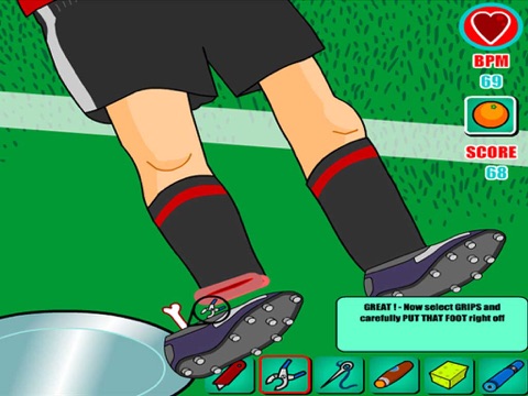 this is a surgery game. Football player has a problem and you have to operate him. The game is played with finger and game tell you, how to play. You are an important position on football field, you are a soccer doctor. Have fun.