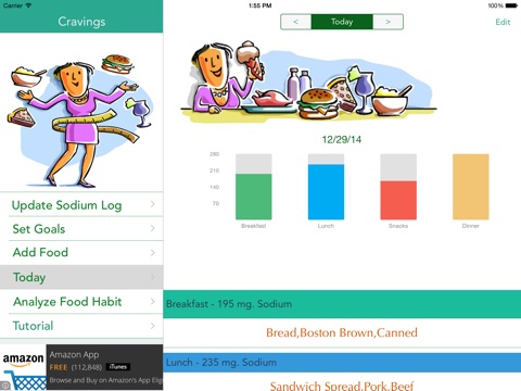 1. "Sodium Cravings" ensures that you meet your daily sodium intake goals every day. It does this by analyzing your food habit and then by selecting and presenting the right breakfast, lunch, dinner and snack choices from within your list of foods, which will help you, meet your daily sodium intake goal.