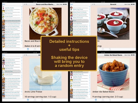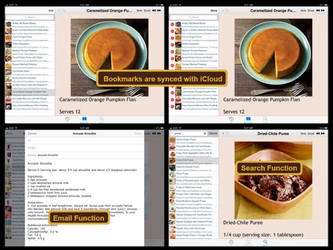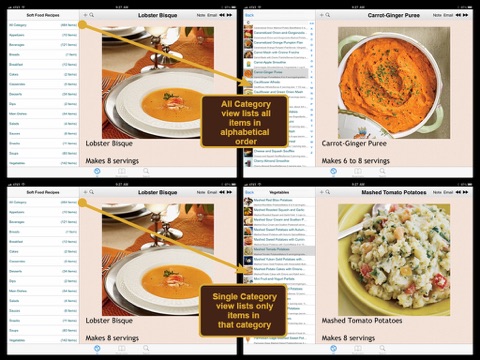 Soft Food Recipes is an application containing over 450 detailed cooking recipes that are soft in texture. The recipes are grouped into different categories for easier reference (appetizers, breakfast, juice, snacks, salad, dessert, main dishes, soup etc.). For each recipe included in this App, a photo, an ingredient list, and a step by step cooking direction, and a detailed nutritional table is provided.
