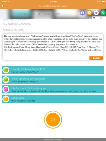 "SoFunNear" shows events with offers nearby, and provides new experience of offers, gifts, souvenirs, or coupons redemption. By completing the FunTasks such as Multiple Choices, Selfie, QR Code, Open Ended, you may redeem offers from organisers(Terms & Conditions Applied.)