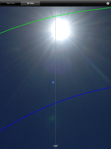 Solar Exposure Lite shows the seasonal path of the sun in the camera view of the app. Red is the path at the winter solstice, green at the spring/fall equinoxes, and green at the summer solstice. The solar path depends on your latitude, which is provided by the devices GPS.