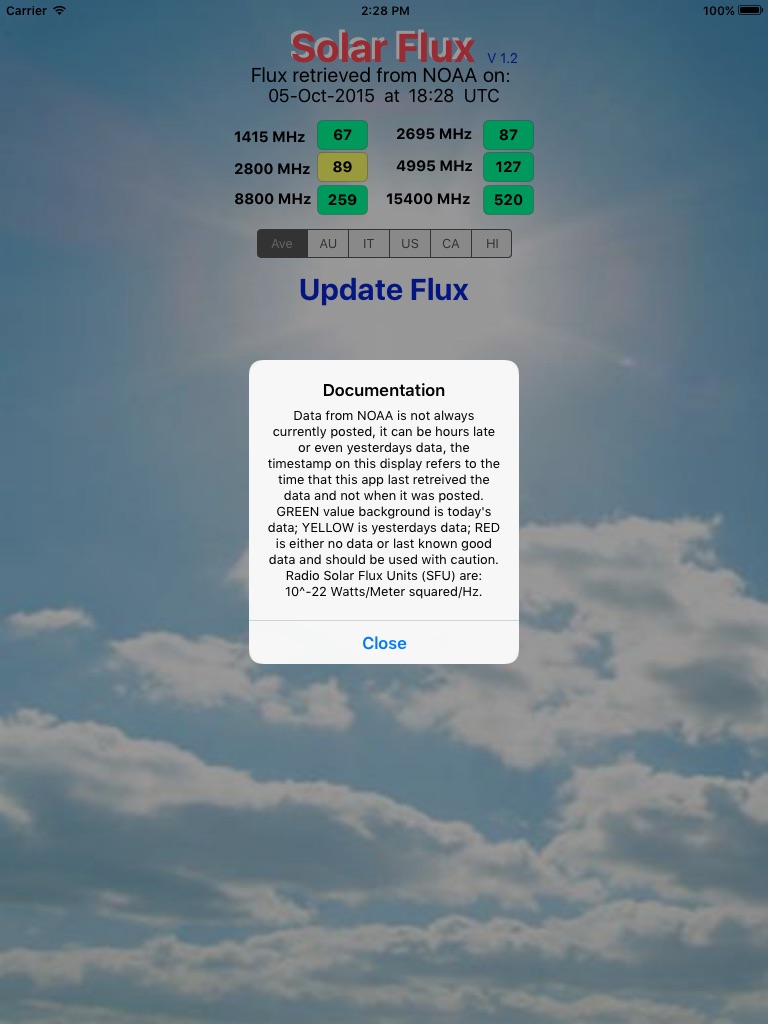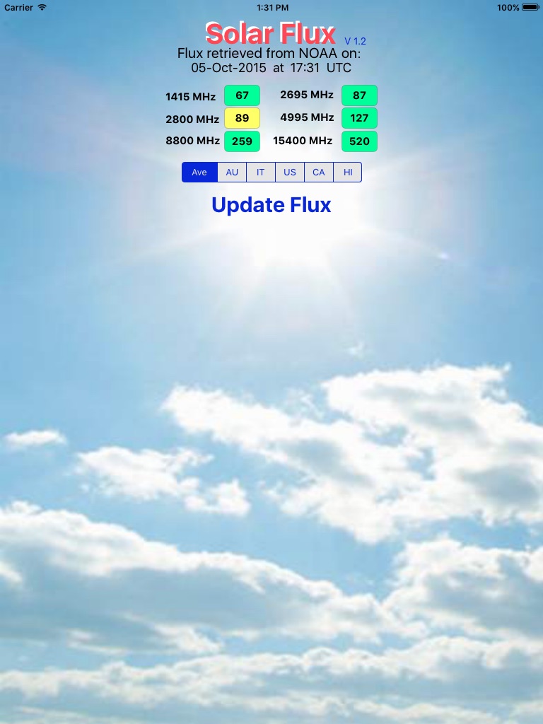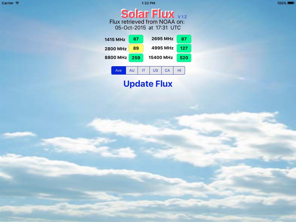This application provides the average "Radio Solar Flux" (sfu) (10^-22 W/m^2/Hz) units obtained from NOAA (US Government Weather). Solar Flux is used in space weather forecasting, antenna figure of merit testing, and other scientific applications. The flux values for each radio frequency are available by separate measurement stations or are by default averaged amongst the worlds measurement station in near real-time. The stations used are: