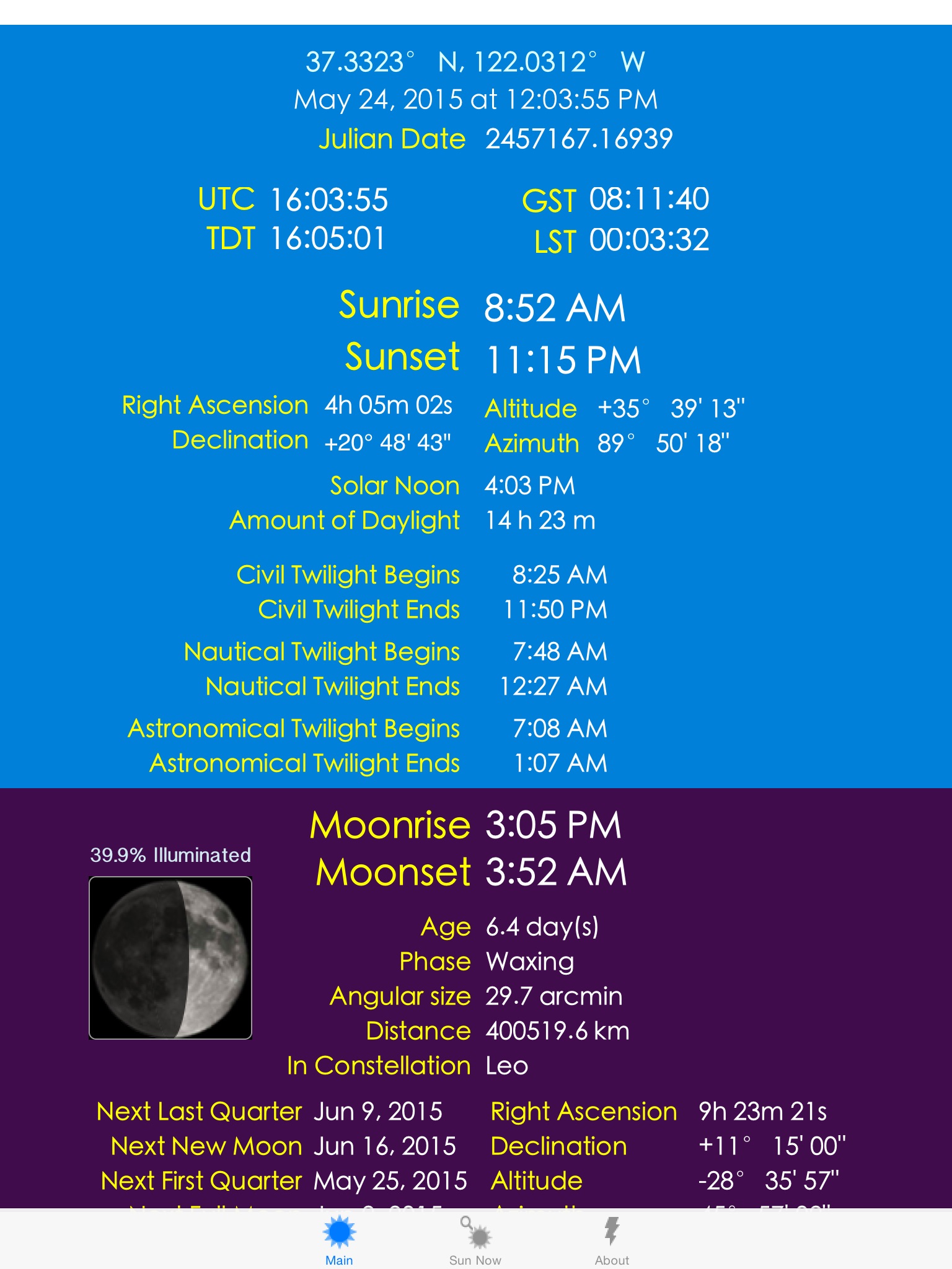 This is like having the nautical almanac gone mobile. Great info at ones finger tips!
