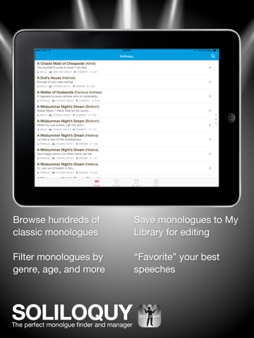Soliloquy™ is the perfect monologue finder and manager for students and theatre professionals. Do you need a monologue for auditions for a class? Are you tired of the same overdone monologues that everyone seems to perform over and over? With many monologues to choose from youll find just the right speech for you.