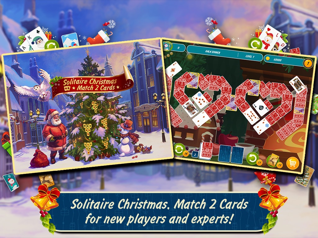 Solitaire Christmas. Match 2 Cards. Card Game is a holiday card game filled with the joyful spirit of the holidays. The anticipation of Christmas miracles and 120 unique levels form a winning combination for fans of classic solitaire. After all, what more could a solitaire player want other than meals with their relatives in a cozy house, snowball fights, christmas trees, brightly colored presents, fresh snow, the beauty of the winter season, and having a ball sledding and ice skating?