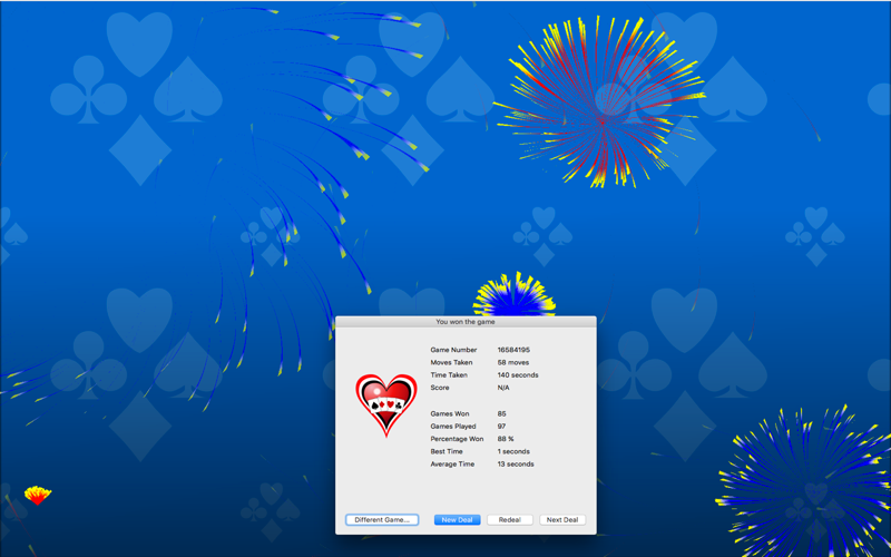 - Fireworks when you win. We know that some deals of solitaire can be quite a challenge( Weve been known to spend days solving a single deal), so we decided winning was worthy of some fireworks!