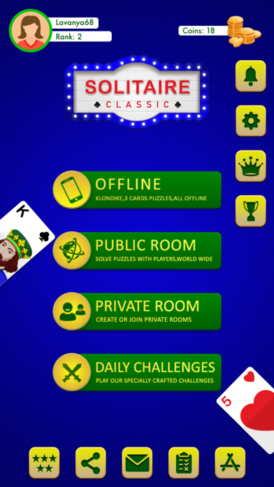 Show where you stand in the world of Solitaire Klondike experts. Try to top the leader board with your immaculate problem solving skills. You can also unlock and earn several surprising achievements while you are on the way to top the charts.