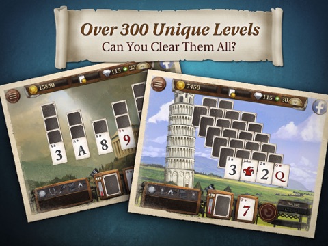 Welcome to one of the most thrilling solitaire games available! Featuring solitaire hands dealt across over 300 beautifully crafted levels taking place across the ancient world from Egyptian Pyramids to the lost civilizations of the Americas.