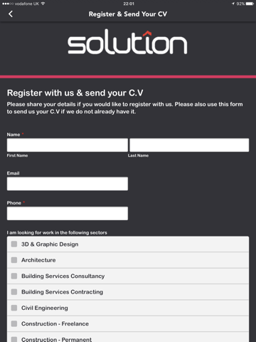 This app will provide you with a great user experience of the latest job openings in Technical, Construction and Design in London and the South East. Solution have offices in Bishops Stortford and London. You will have access to real-time, up to date jobs giving you the upper hand to be the first to apply for your dream job. Interact with your friends by sharing this app. Send us voice messages and photos of you in your new role. Team profiles. Read the profile of your Solution consultant and request a meeting at the touch of a button. Catch up with the latest news about Solution.