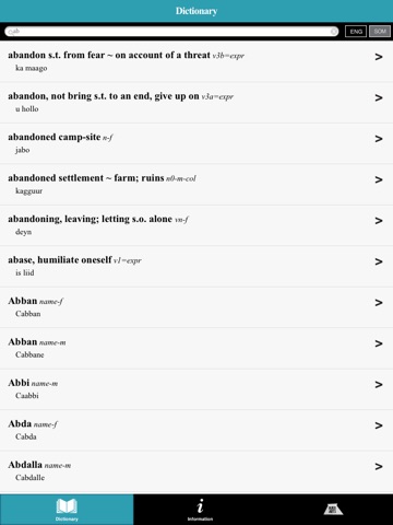This bilingual Somali–English dictionary is the first FREE and comprehensive Somali dictionary app. The app has over 26,000 entries and is growing. It lets users translate Somali to English and English to Somali. It includes sound files for some 240 words (more planned in future versions) and has example sentences throughout.