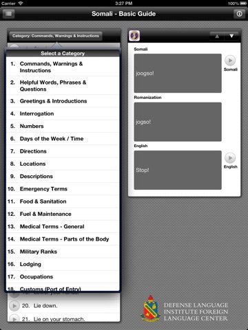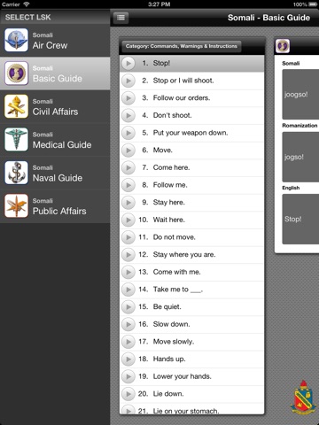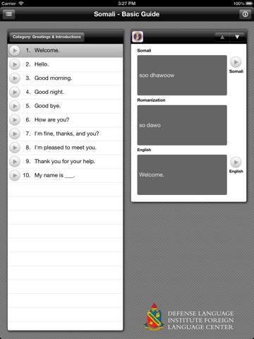 This is the Somali Language Survival Kit (LSK). LSKs are designed by the Defense Language Institute Foreign Language Center as a quick reference tool for deploying service members. LSKs contain mission-specific vocabulary and simple phrases in topics such as Medical Terminology, Civil Affairs, Public Affairs, Air Crew and Navy.