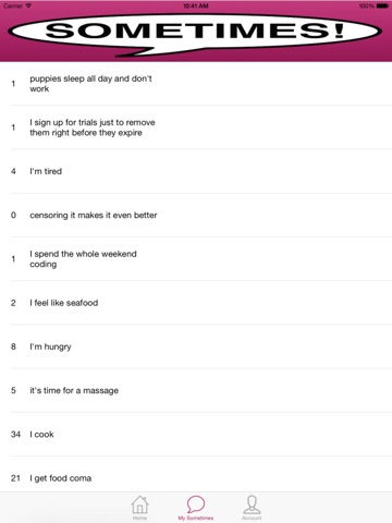 Sometimes... is a private messaging app that makes funny statements. Enter in a Sometimes statement, browse other statements, rate, or share with friends. Try Sometimes... and start laughing today