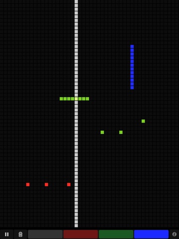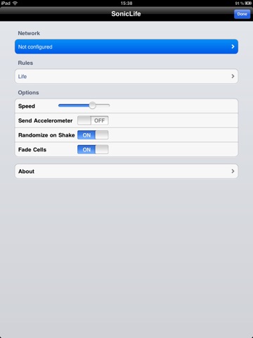The application runs a simple cellular automaton on a grid of cells. The cells can be interacted with by touch and triggers of three different colors can be placed on the grid. The automaton can be set to five different rule-sets, from classic Game of Life to simple horizontal or vertical stepping. Triggers are fired by "alive" cells and send their state as OSC messages to a configurable host on the same Wi-Fi network. Cells and triggers can be randomized by shaking the device.