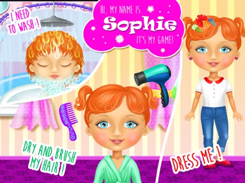 • Help little Sophie get ready: shower, wash and style hair, dress up and learn to combine clothes and accessories.