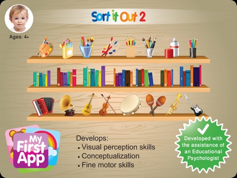Tidying up the nursery has never been more fun. Teach your child about sorting and arranging with this fun, sorting application. This application helps develop conceptualization, visual perception and fine motor skills. With parental assistance it can also develop language skills.