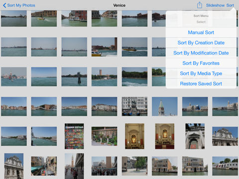 Manual sorting of photos in an album via drag and drop in addition to a selection of quick sorts by creation date, last modification date, favorites, or media type;