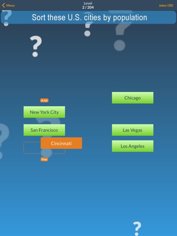 The Sorting Quiz trivia game app shows you different tasks like “Sort these cities by population”, “Sort these celebrities by age”or “Sort these U.S. presidents by year of their inauguration”.
