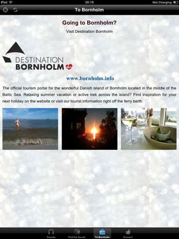 You can use Sound of Bornholm as a tourist guide to find the lovely surroundings where sounds are recorded. You can also find attractions, restaurants, and shopping near your location using the "nearby places" function.