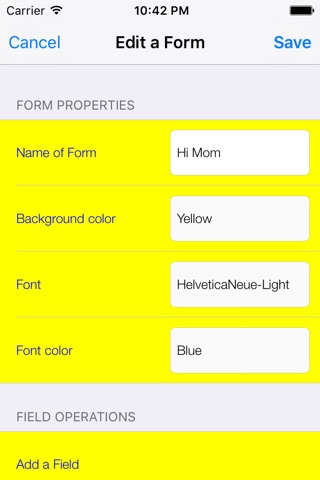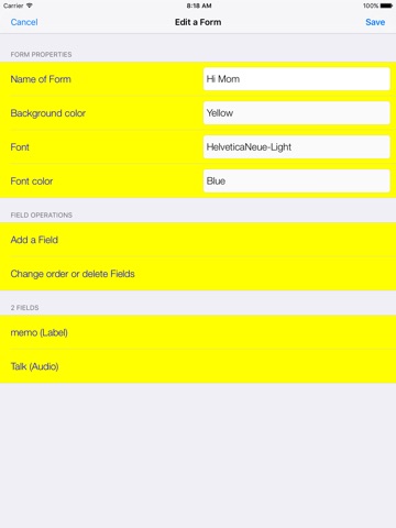 To record sound, a Form has to be created. Tap Form management, add a new form("+"). You can type name of the Form, choose background color, font and font color. Then some Fields have to be added. Tap Add a Field, type Field title and choose Field type. Field type can be either Label or Audio. For Label Field, you can type the text you want to display. For Audio Field, you can record, append and add music file. Tap Done and Save.