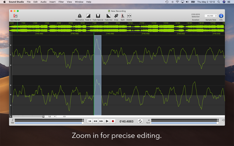 Sound Studio est depuis longtemps un excellent candidat pour des enregistrements mono ou stéréo, là où on na pas besoin dun vrai studio complet. Sa légèreté est un avantage énorme, la place est disponible pour le signal, autant sur le disque dur que dans le processeur. Sa prise en charge des souris à molette ou à trackpad accélère considérablement les zooms sur le signal et les mouvements de la time line. Et jaime aussi beaucoup son affichage (récent) des durées de fichier, ou de zone de sélection, et de la position de la tête de lecture. Parfois encore un peu instable avec certains plug ins, ce qui me fait retenir la cinquième étoile.