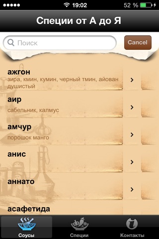 • Полноценный быстрый поиск по базе данных раздела «специи». Вы сможете найти нужную вам специю за секунду.