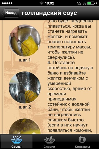 Программа порадовала кол-ом рецептов соусов, тем что их применение разбито на разделы, понятное описание рецептов, здорово что вместе с соусами есть описание специй, очень много информации полезной, нашел что искал, спасибо!