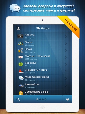 Теперь в приложении есть форум, где можно обсудить вопросы и мнения на определенную тему. Все, что нужно - это зайти в интересную категорию и открыть чат! Это будет чат, созданный пользователем! Теперь можно обсудить самые любопытные стороны мужской жизни!