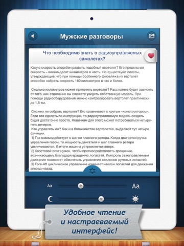 В своем девайсе представителю сильного пола будет просто уместить сборник различных советов, инструкций, рецептов и пояснений. Статьи можно добавлять в список “Избранное”, а также искать нужную информацию с помощью поисковика.