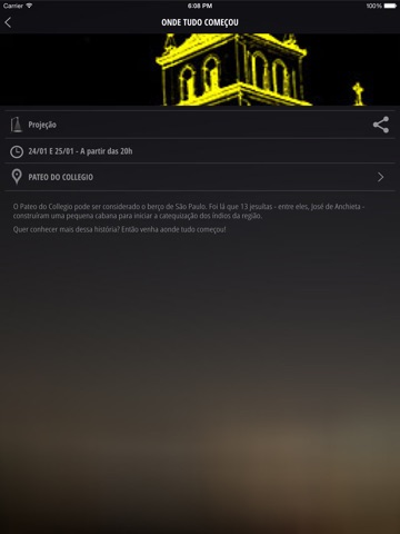 Nos locais históricos da cidade, iremos relembrar momentos marcantes dos 461 anos dessa brilhante cidade. E, mais uma vez, utilizando os próprios postes de luz da companhia para projetar mensagens no asfalto. Mas agora, além das frases que contam fatos marcantes, contaremos com artistas encenando os fatos históricos que aconteceram em São Paulo, nos próprios locais em que ocorreram. Esse presente também é para você. Contamos com sua presença.