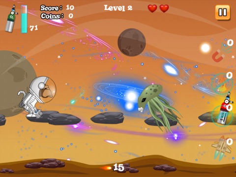 Game Play: The Baboon will jump from one floating rock to another without hitting the ground. He has to collect the oxygen packs, health packs otherwise his health deteriorates. He has to collect data and reach the spaceship before time runs out. He has to collect the bananas for extra points. If throughout his journey he hits the ground or is hit by any alien, the game is over.