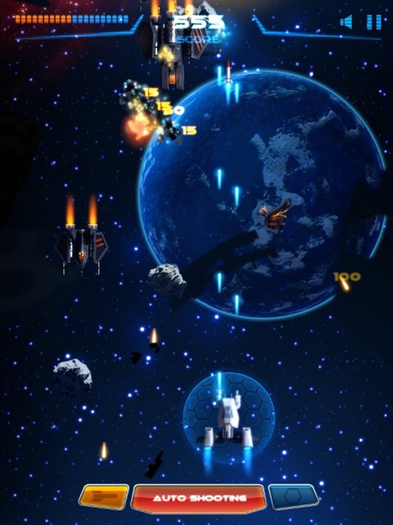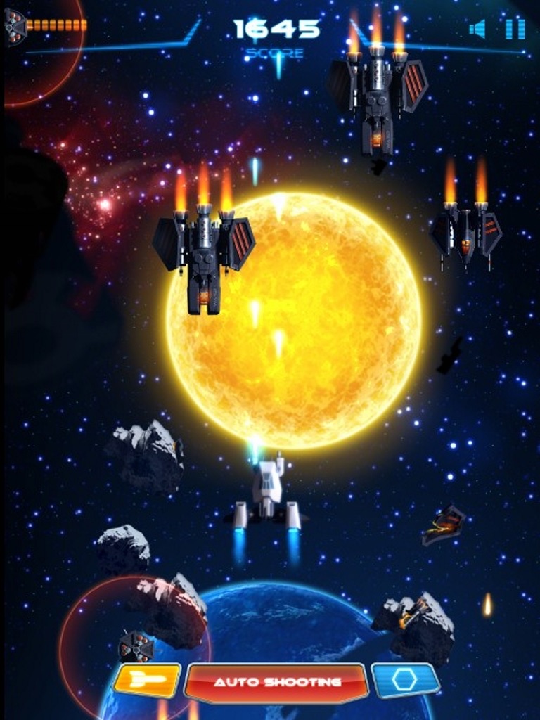 Shoot the enemy and travel through the galaxy! They attempt to use their force to rule the Earth and the solar system. People on the Earth fight back, using three types of plane-fighter jets, which are newly developed and equipped with modern weapons, to start fighting back.