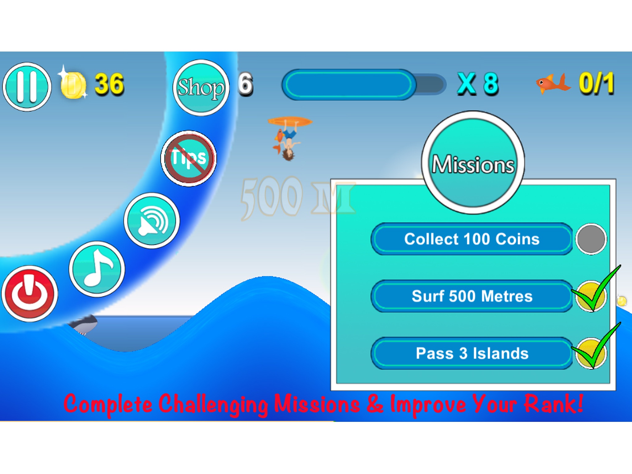 Tap to surf the downslope of the wave, release at the bottom of the wave and let Tyrone jump. Gain momentum and launch into space to surf on a UFO. Slow down and the shark will bite.