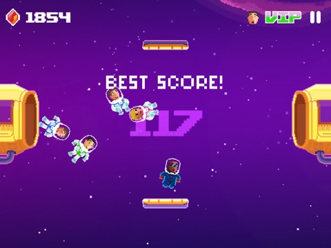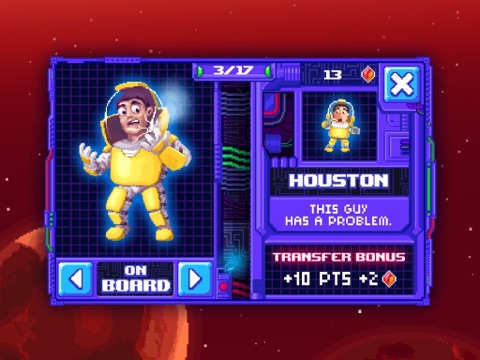 If you want to understand what Space Transfer is, you need to imagine the old electronic handheld game... combined with a freakin Space Station. Tapping left or right side of the screen, moves the top and bottom bars simultaneously and prevents astronauts from becoming just another space debris. Transferring your crew from one side to another lets you earn points. Special astronauts on top of having their unique moves, let you earn gems (and points) when rescued.