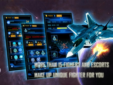 ▶ Six type of aircraft with 10 level and nine type of escort, combine your unique Space Fighter.