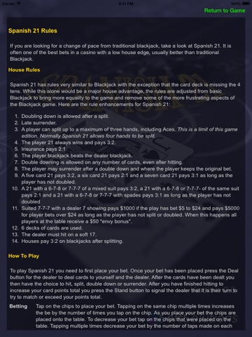 The iPhone version of Spanish 21 uses the capabilities of the iPhone to provide the most interactive card game on the iPhone. While most card games are an excursive in button pushing, in Spanish 21 cards are split my moving cards on the table. Chips can be moved and hits are initiated by tapping on the card stack to hit. This makes the card play closer to the casino experience.