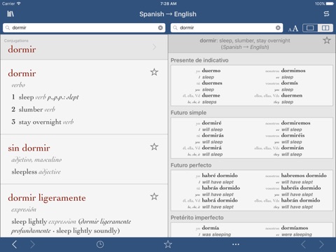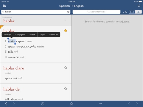 Dictionary is very good and i think worth the price; its helping me a lot here in argentina. However, Developer, please update the app and include one touch definition from the verb conjugation feature. Why cant we click on the infinitive of the verb for definition when using the verb conjugator? We need to re-type the word in the definition search, this can be time consuming and is not intuitive! Otherwise keep up the good work