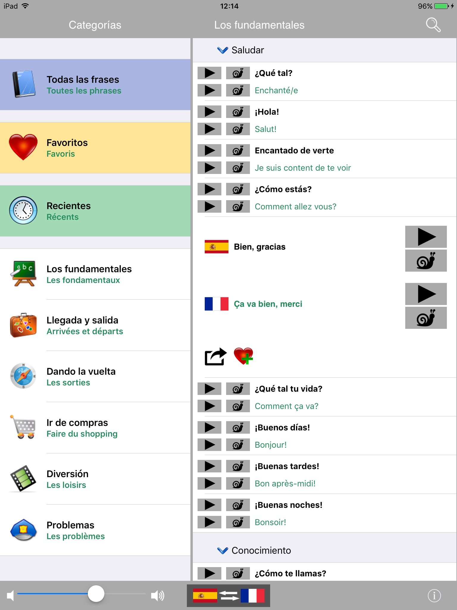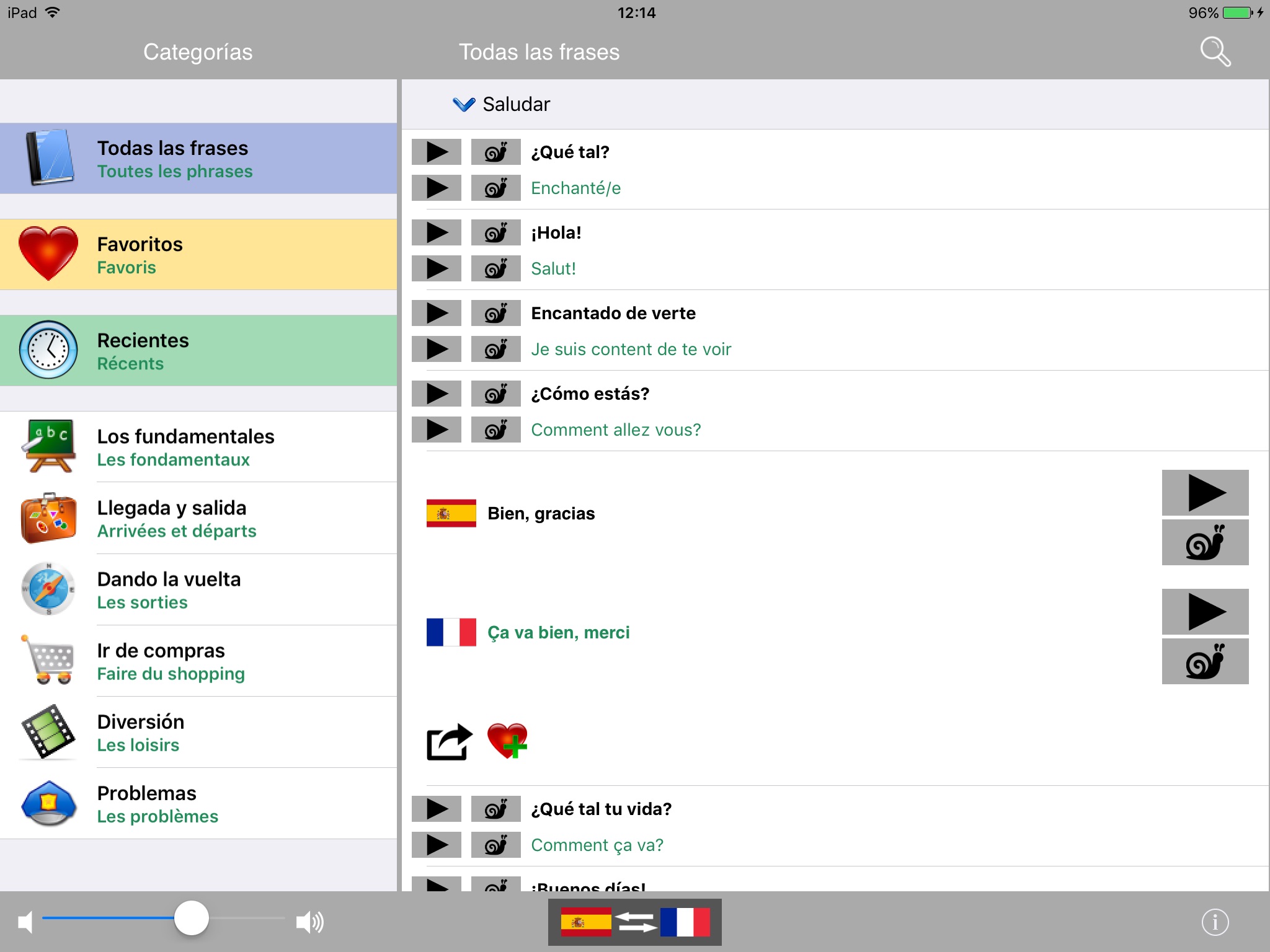 The French phrasebook / translator contains a list of 1300 english phrases, professionally translated into French. It is possible to listen to the pronunciation of each phrase.