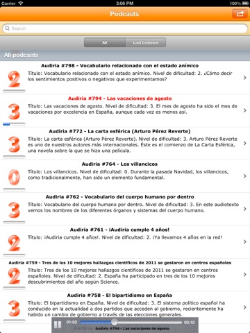 This gives audio and a written transcript in Spanish so you can read along or read first, learn the vocabulary and then listen. There are four levels of difficulty so you can pick episodes for your level. The reason I havent rated it with 5 stars is because there is no way to slow the speakers voice, nor is there a 10 second playback and there is no translation built into the ap. Those are small issues however and it has really helped with my overall comprehension. Worth .99 cents if you are serious about learning Spanish