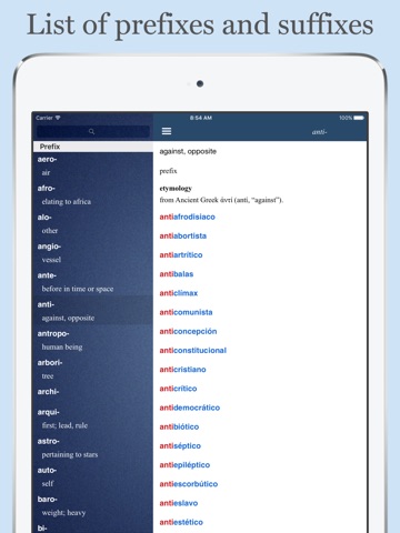 This app will provide you with a comprehensive reference for the Spanish prefixes and suffixes. You can also find a list of words that derive from the same prefix or suffix.