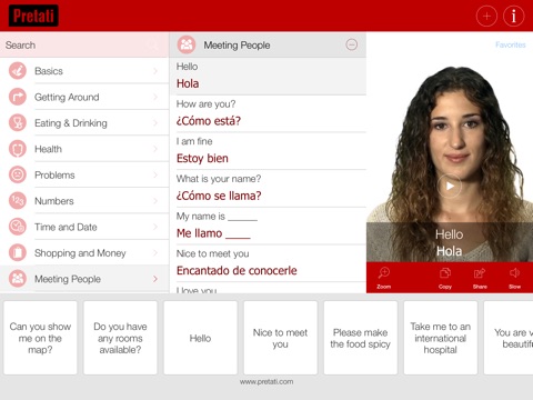 Do you ever wish when traveling that you could have someone who could teach you their local language or even speak it for you when needed? Spanish Pretati is truly a unique language translation app utilizing video and voice to help travelers all over the world easily learn and communicate in Spanish. Spanish Pretati contains over 500 important phrases and words that international travelers will need most when visiting Spain or when communicating with somone in Spanish.