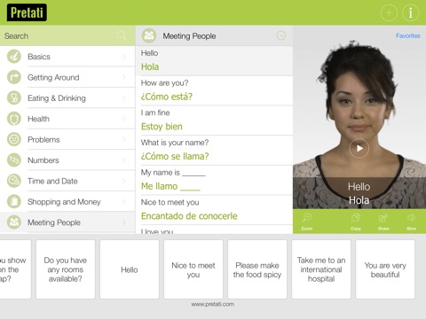 For each phrase, there is a video of a native Spanish speaker pronouncing each word clearly, the Spanish script and also the phonetic pronunciation of the phrase. For added convenience, the phrases are grouped into intuitive categories for the most common travel situations including Getting Around, Eating & Drinking, Spanish expressions, Health, Problems, Numbers, Time and Date, Meeting People, Shopping, Money and even the necessary Spanish survival phrases. Other first of their kind features include the ability to playback each Spanish phrase in slow mode, mark favorites for quick reference and even copy the phrase to send via SMS or email to your friends back home. You can quickly share these to your social media circles too! While the app is primarily targeted towards travelers visiting Spanish speaking Latin America, it is also a great learning tool for those who desire to start learning the basics of the Spanish language in an easy, fast and fun way.