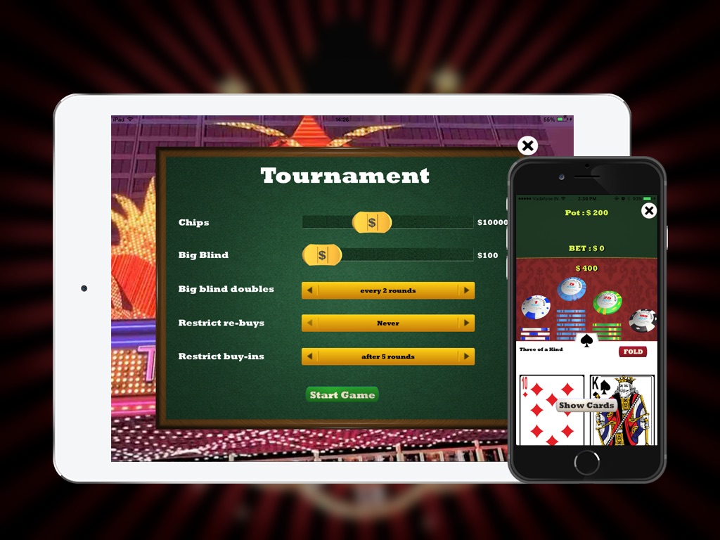 2. Use one device, preferably an iPad, as Poker table: Select "Cash Game" or "Tournament Game" from the menu and select "Start Game"