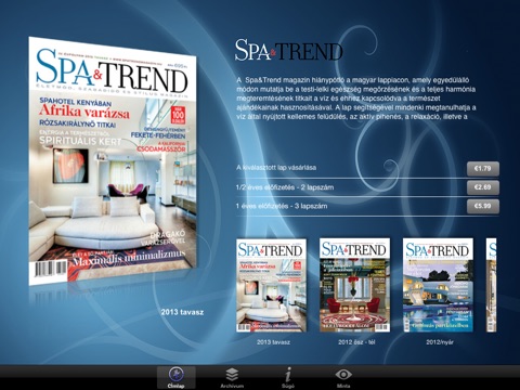 A Spa&Trend magazin hiánypótló a magyar lappiacon, amely egyedülálló módon mutatja be a testi-lelki egészség megőrzésének és a teljes harmónia megteremtésének titkait a víz és ehhez kapcsolódva a természet ajándékainak hasznosításával. A lap segítségével mindenki megtanulhatja a víz által nyújtott kellemes felüdülés, az aktív pihenés, a relaxáció, illetve a felfrissülés hatékony lehetőségeit. A lifestyle, az egészség és a harmónia titkait szakemberek segítségével mindenki számára érthetően, de a megszokottnál mélyebb összefüggésekben tárgyaljuk. Így a magazinban megjelenő írások egyformán szólnak azokhoz, akik már rendelkeznek otthoni relaxációs eszközökkel masszázsmedencével, uszodával, szaunával, fitneszhelyiséggel, illetve vágyat keltenek azokban, akik még nem szerelték fel lakásukat hasonló berendezéssel.