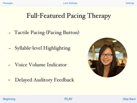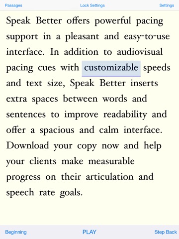 It offers speed-adjustable Visual, Tactile, and Audio feedback for reducing rate of speech, increasing utterance length, and sequencing sounds in multisyllabic words while reading aloud from specially designed practice material (included in the app).