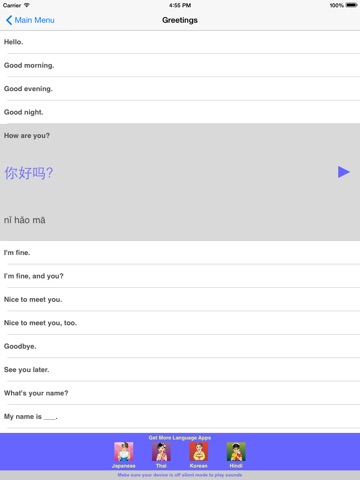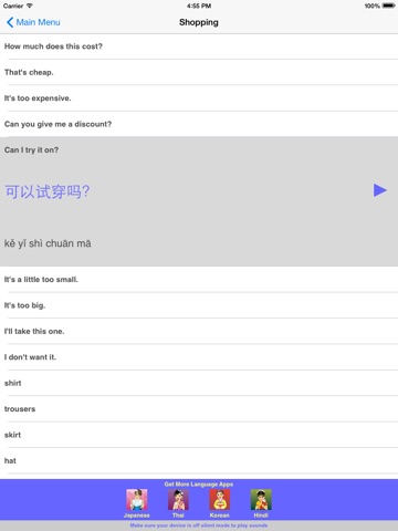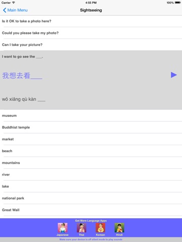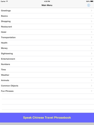 Great for travel or study! Speak Chinese Travel Phrasebook is an easy to use talking phrasebook for Mandarin Chinese. Each phrase is displayed in large sized simplified Chinese characters, Pinyin phonetic transliteration complete with tone marks, and English translation. Hear the audio for each phrase in a clear, pleasant voice from a native Chinese speaker. There are over 500 words and phrases in the following categories:
