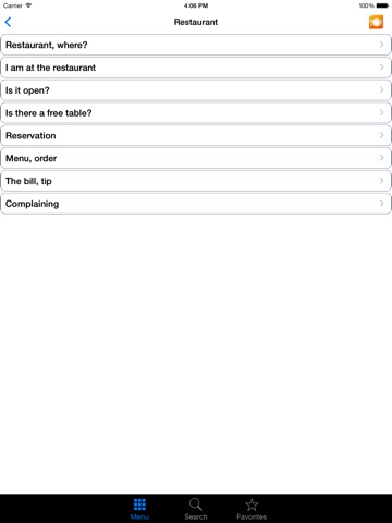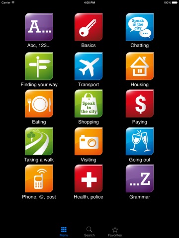 → A MENU of 15 headings where you discover the alphabet, key phrases for starting a conversation, finding your way, travelling, housing, eating, shopping, paying, taking a walk, visiting, going out, calling, emergencies, etc.